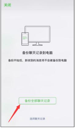 第三步:完成上一步后,手機端詢問是否備份聊天記錄,點擊【備份全部聊天記錄】。也可以選擇聊天記錄進行備份。