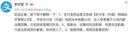 1、支付寶的運(yùn)營主體是【支付寶(中國)網(wǎng)絡(luò)技術(shù)有限公司】,并非支付寶(中國)信息技術(shù)有限公司,法人變更屬于公司內(nèi)部治理范疇,與實(shí)際經(jīng)營情況無關(guān)。