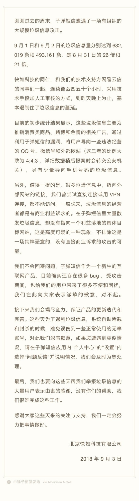 據悉,9月1日-9月2日也就是上周末,子彈短信中的垃圾信息量分別達到632019條和493161條,是8月31日的26倍和21倍。快如科技和技術支持方網易云信的團隊一起,連續奮戰了四五十個小時,采用技術手段加人工審核的方式,到昨日晚間才基本控制住了垃圾信息的蔓延。