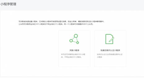目前微信支持公眾號(hào)和小程序的互通關(guān)聯(lián)。微信公眾號(hào)可以快速關(guān)聯(lián)和創(chuàng)建小程序,小程序也可以展現(xiàn)公眾號(hào)的內(nèi)容。已關(guān)聯(lián)的小程序可被使用在圖文消息、自定義菜單、模版消息和附近的小程序等場景中。公眾號(hào)可關(guān)聯(lián)同主體的10個(gè)小程序及不同主體的3個(gè)小程序。同一個(gè)小程序可關(guān)聯(lián)最多500個(gè)公眾號(hào)。通過微信公眾號(hào)后臺(tái)的小程序管理功能,只需要簡單操作便可完成關(guān)聯(lián)和創(chuàng)建,并完成不同場景的展現(xiàn)。