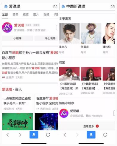 以愛說唱智能小程序為例,在百度搜索里直接搜「愛說唱」,會在結果頁最上方呈現智能小程序;如果搜索一檔說唱相關綜藝節目「中國新說唱」,結果欄也會出現「愛說唱」智能小程序。再以攜程小程序為例,只要用戶近期存在針對旅游資訊的搜索行為,并且關注了推送旅游攻略與優惠信息的百家號,攜程智能小程序就會自動被推送出現在手機百度 feed 流推薦之中,從而達到喚醒用戶的目的。不論是哪種方式,從中都可以窺見百度試圖盤活存量搜索數據、打通內容——信息——服務最優鏈路的愿景與初心。
