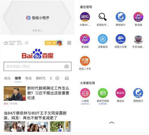 雖然百度版的智能小程序僅僅推出了兩月有余,百度小程序在更新迭代上,從未表現出絲毫的懈怠。現在用戶可以直接從手機百度 APP 首頁下拉調取進入小程序頁面,雖然與微信的首頁下拉采取了相同的調取方式,但是相較于微信的半屏展示,百度的全屏呈現顯然使得小程序的排布更加符合視覺習慣,更加便于用戶的查找與點擊。