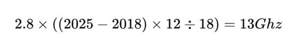 但假設(shè)我們使用了黑科技提升主頻。等到了 2025 摩爾定律失效時,我們的手機 CPU 主頻應(yīng)該達到: