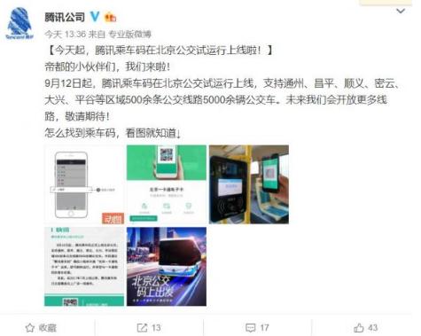 騰訊官方微博宣布,騰訊乘車碼在北京公交試運(yùn)行上線,目前騰訊乘車碼支持通州、昌平、順義、密云、大興、平谷等區(qū)域500余條公交線路5000余輛公交車。