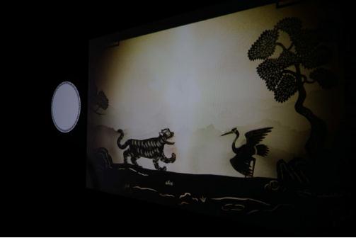 因?yàn)橐w現(xiàn)皮影的效果,所以房間里比較暗,不好拍照。不過皮影戲確實(shí)十分有意思,看著自己用手比出來的動物在幕布上舞動,這種感覺還是挺有趣的。