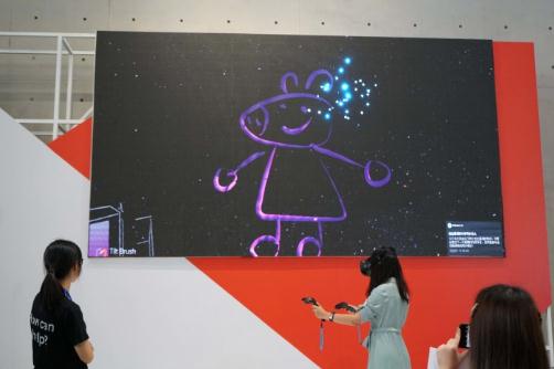 在 AI 體驗(yàn)展的現(xiàn)場,Google 也把這套應(yīng)用搬到了線下。利用 VR 設(shè)備,你就可以變身為虛擬世界的造夢人,在無限的空間里激情揮灑創(chuàng)意。現(xiàn)場還有人用 Tilt Brush 畫了一個小豬佩奇。
