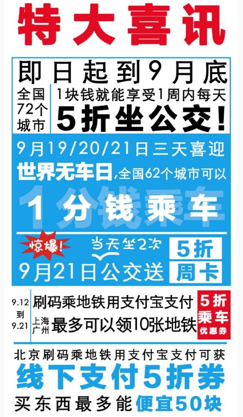 原來,9 月 22 日是世界無車日,支付寶又給出了“5 折坐公交”,甚至“1 分錢乘車”的福利。