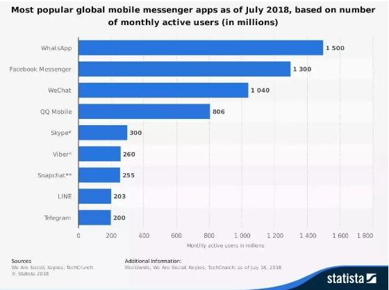 在海外市場,微信雖未如國內一般與 QQ 成為社交霸主,但是也占據了相當大的份額。