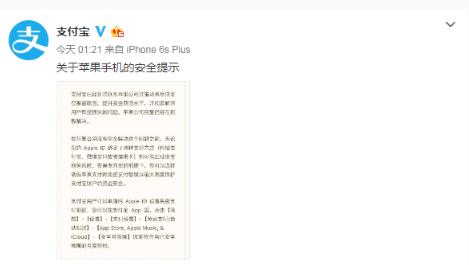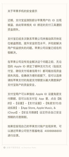 10 月 10 日上午消息,支付寶在其官方微博發布關于蘋果手機的安全提示,稱監測到部分蘋果用戶 ID 被盜,由此帶來 ID 綁定支付工具遭到資金損失。