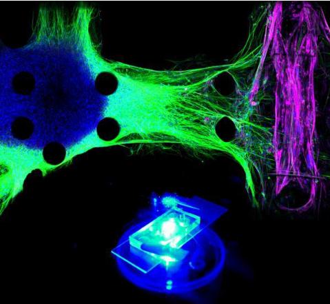 “芯片器官”:綠色部分為漸凍癥患者誘導性多能干細胞分化而成的運動神經元,紫色部分為肌肉組織。