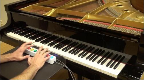 谷歌的這一靈感來源于音樂電子游戲《搖滾樂隊(duì)》和《吉他英雄》,其 Magenta 創(chuàng)意研究團(tuán)隊(duì)在此基礎(chǔ)上進(jìn)一步創(chuàng)作,創(chuàng)造了一個(gè)智能控制器“鋼琴精靈”。用戶敲擊按鍵時(shí),它可以將其譯為使用所有 88 個(gè)鋼琴鍵而彈奏出的音樂。