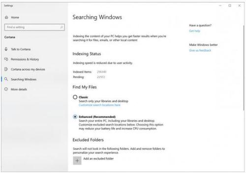 用戶啟用增強搜索模式后,Windows 10 將索引的不僅僅是放置在庫中的文件。這意味著系統會索引所有文件和文件夾以創建數據映射。索引過程可能需要 5 分鐘或更長時間,因為它完全取決于本地驅動器上的文件數。但是,用戶可以從索引中排除路徑或位置以加快進程。