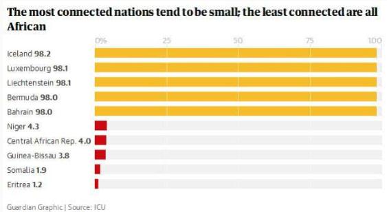 但是很多地方沒有跟上步伐。在坦桑尼亞、烏干達和蘇丹,大約有 30-40% 的人可以上網。在幾內亞、利比里亞和塞拉利昂,只有7% 到 11% 的人能上網。在厄立特里亞和索馬里,只有不到2% 的人可以聯網。