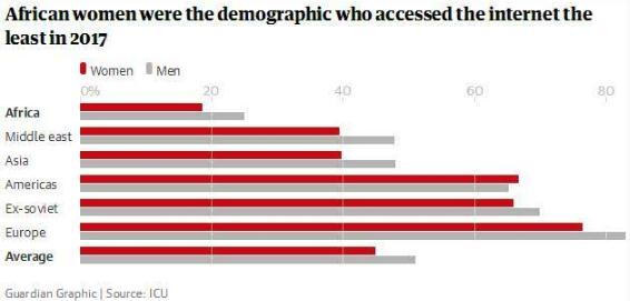 還有嚴重的性別差異:在世界上三分之二的國家,男性主宰著互聯網的使用。在全球范圍內,女性網民數量比男性少 12%。雖然自 2013 年以來,大多數地區的數字性別差距縮小了,但在非洲卻擴大了。國際電信聯盟說,在那里使用互聯網的女性比男性少 25%。