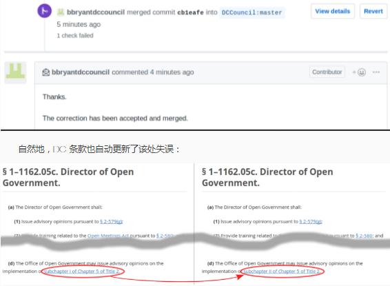 其中,“subchapter I” 應為 “subchapter II”,于是 Joshua 提了一個 PR 更正該錯誤。幾天后,委員會的編纂律師將其合并: