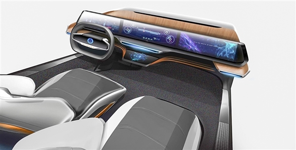 據悉這種智能駕駛艙沒有配備任何物理按鍵,中控臺上有一體式超大屏橫貫,內含左中右三塊屏幕,分別為液晶儀表屏、中控顯示屏與副駕駛娛樂屏,同時在超大中控屏中下方還有一塊車輛信息顯示屏,果真找不到一個物理按鍵。