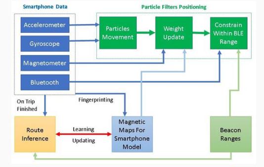這個系統(tǒng)是自適應(yīng)的,并不斷重復(fù)訓(xùn)練,從而保證不同用戶和不同的智能手機型號都具有高精確度。其方法是分析終端用戶的定位會話,從而增強系統(tǒng)的知識庫,以便為不同型號的智能手機讀取磁場數(shù)據(jù)。一旦用戶退出智能手機室內(nèi)定位應(yīng)用程序,系統(tǒng)將在云基礎(chǔ)結(jié)構(gòu)中處理記錄的傳感器讀數(shù),并嘗試重構(gòu)用戶的路徑。這種新的技術(shù)稱為“路徑推理”,它基于粒子濾波和形狀匹配。它允許研究人員在該區(qū)域的磁圖上添加新的信息層。因此,同一款智能手機的后續(xù)定位會話具有更高的準(zhǔn)確率。