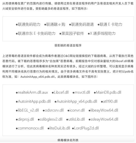 在接受虎嗅采訪時,騰訊安全實驗室負責人 TK 分析認為:“從現有的報告來看,這跟當年的熊貓燒香差不多。你說為什么這么傳播廣,寫易語言程序的人,他寫的程序本身是會被殺毒軟件干掉的,黑產或灰產的程序本身就是這些人寫的,會被很多殺毒軟件查殺,所以他們(被感染的這些)自身也不會裝這些殺毒軟件。”所以這些人開發的薅羊毛軟件被感染了病毒而不自知。