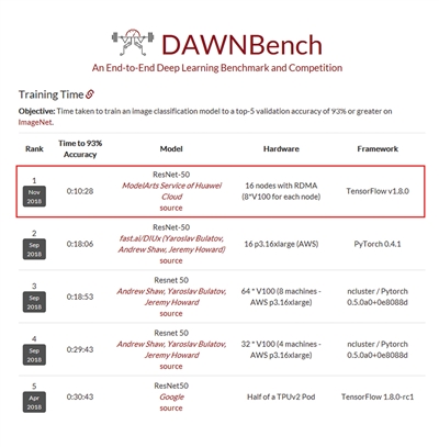 近日,斯坦福大學發布了 DAWNBenchmark 的最新成績,在圖像識別(ResNet50-on-ImageNet,93% 以上精度)的總訓練時間上,華為云 ModelArts 排名世界第一,僅需 10 分 28 秒,比第二名提升近 44%。成績證明,華為云 ModelArts 實現了更低成本、更快速度、更極致的體驗。