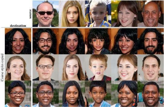 新系統的靈感源自所謂的風格轉移,也就是對圖像(比如說一張畫)的重要風格特征進行提取,并應用到另一張圖像的創作當中,如果一切順利的話,最終得到的圖像應該跟原來的擁有類似外觀。就生成面孔而言,這里的“風格”并不是指筆觸或顏色分布,而是圖像的構成(居中,靠左或靠右,諸如此類)以及臉部的生理特點(膚色、雀斑以及毛發)。
