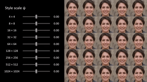 這些風格特征或大或小,尺度各異——在非常小的時候,它可能是面部的單個特征;在中間的時候,它可能是鏡頭的構成;在最大尺度上,它就是圖像整體色調之類的東西。讓系統對所有這些特征進行調整,整張圖像就會發生變化;與此同時,僅僅調整一部分可能只會改變一個人的發色,或者是雀斑或面部毛發的分布。