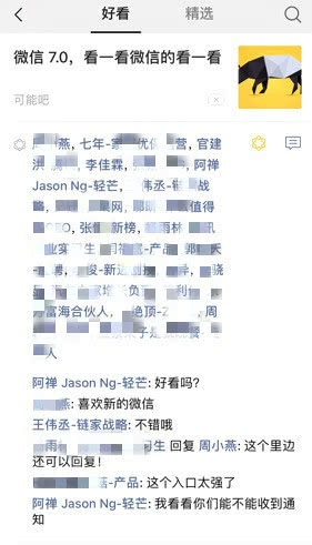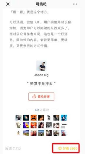 原先存在于文章底部右下方的“點贊”功能被替換為“好看”。需要注意的是,經過測試,該功能只適用于微信 7.0 版本發版之后,所發布的新文章。發版時間點之前,更新的文章底部依舊是“點贊”功能。