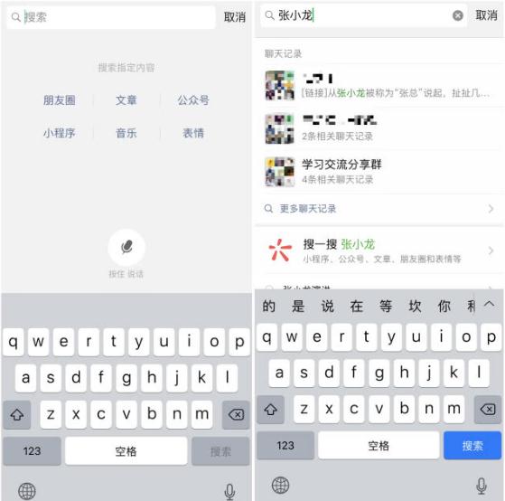 在之前版本的微信中,只允許用戶在搜索框內進行文字搜索,7.0 版本中出現“語音”功能鍵: