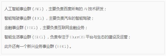 “成為中國(guó)乃至世界的 AI 標(biāo)桿企業(yè)”,是陸奇為百度立下的新使命。百度集團(tuán)在此次技術(shù)架構(gòu)調(diào)整前,擁有的六大事業(yè)群中,除了主營(yíng)傳統(tǒng)的搜索引擎服務(wù)的搜索公司,其余各部門都是 AI 戰(zhàn)略的一部分——