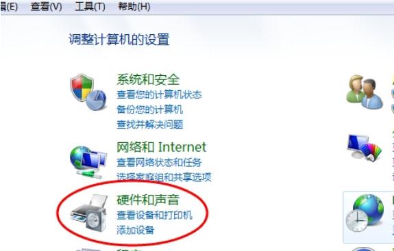 在彈出的對話框里點擊“硬件和聲音”選項進入下級頁面;