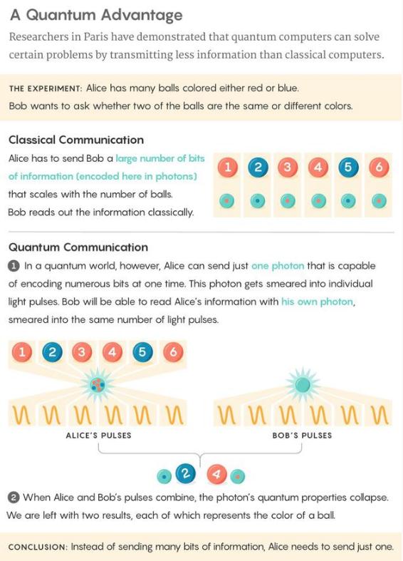 伊萊妮·迪亞曼蒂、洛達尼斯·凱瑞尼迪斯與尼拉杰·庫馬爾打造了一套量子通訊系統,該系統相對經典通訊系統的優勢可以得到證明。