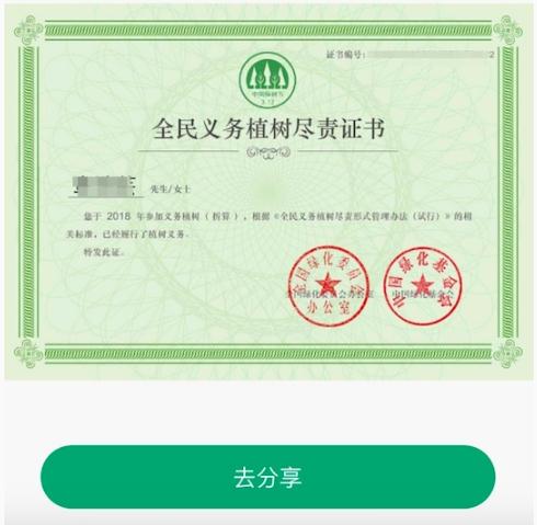 據了解,《全民義務植樹盡責證書》是國家為提高公民參與義務植樹的獲得感、榮譽感,借鑒無償獻血證等方面的管理思路,結合互聯網技術,擬對完成當年植樹義務的公民,通過全民義務植樹網頒發盡責電子證書,每份證書具有唯一的編號和二維碼。