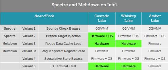 修復(fù)這些漏洞的方式也不同,有的是需要通過操作系統(tǒng)打補(bǔ)丁,還有的需要英特爾升級處理器的 MCU 微代碼,最根本的手段則是物理修復(fù),那就是在新一代處理器上修復(fù)漏洞。對于這個問題,英特爾去年 8 月份開始已經(jīng)在 Whisky Lake 處理器、Cascade Lake 處理器上使用物理修復(fù)的手段了,修復(fù)了熔斷漏洞的一些變種。