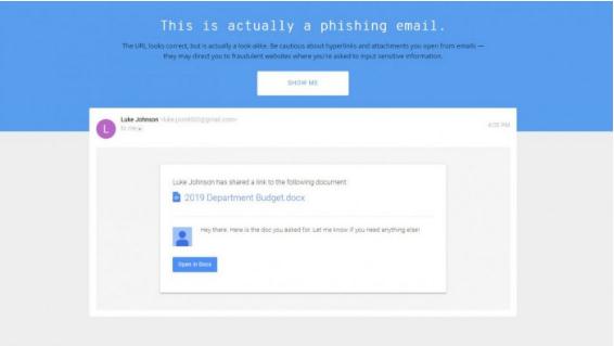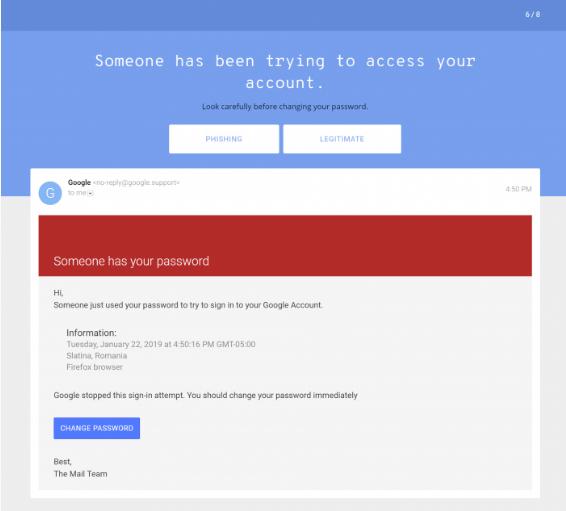 出現在每個項目中都是這種嘗試的跡象,但如果用戶不仔細觀察它們很容易被遺漏。在回答問題后,用戶會看到解釋合法的郵件及網絡釣魚的例子,所以如果用戶在看到釣魚鏈接時不知道如何發現,這可能是學習的好方法。