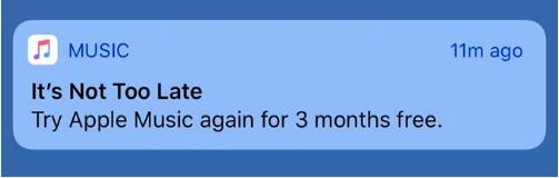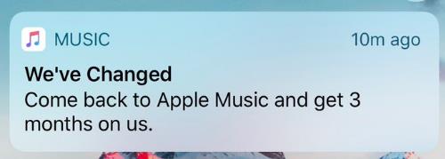 在過去一周中,蘋果向大量iOS用戶發出推送消息,提供給用戶額外的3個月AppleMusic免費試用。這些消息似乎是專門為那些AppleMusic老用戶準備的,這些用戶曾經訂閱了AppleMusic,但后來取消了訂閱,或者是經過第一次3個月免費試用后,沒有選擇訂閱而直接離開的。