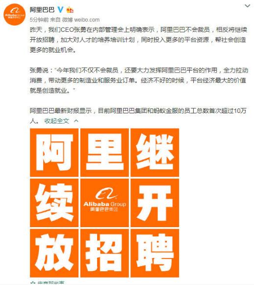 2 月 22 日消息,據阿里巴巴官方微博透露,昨日,阿里巴巴集團 CEO 張勇在內部管理會上明確表示,阿里巴巴不會裁員,相反將繼續開放招聘,加大對人才的培養培訓計劃,同時投入更多的平臺資源,幫社會創造更多的就業機會。