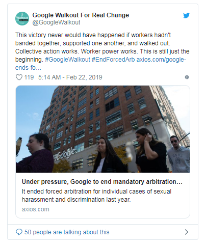 強(qiáng)制性仲裁協(xié)議要求員工在內(nèi)部投訴期間放棄在法庭上提出法律訴訟的權(quán)利。谷歌員工就這一問(wèn)題多次組織抗議活動(dòng),并敦促高管完全結(jié)束這種做法。