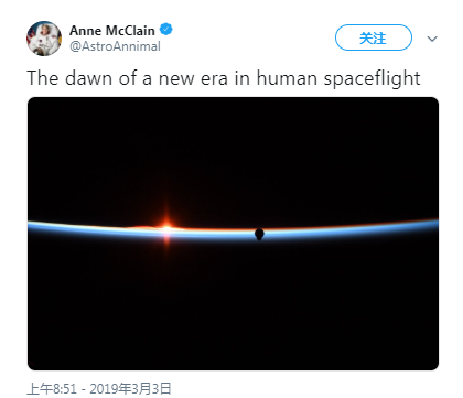 據外媒 Cnet 報道,美國宇航局(NASA)宇航員 Anne McClain 周日在 Twitter 上發布了一張令人嘆為觀止的圖像,并配文稱:“人類太空飛行新時代的曙光。”這張圖像是在 SpaceX 載人龍飛船 Demo-1 首次接近國際空間站進行對接時所拍攝的,展示了這個創造歷史的測試任務。