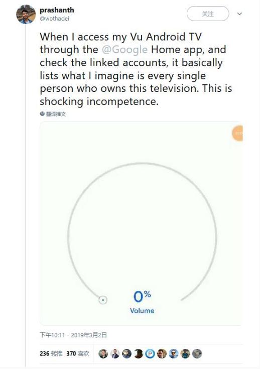 Prashanth 表示他嘗試通過 Google Home 應(yīng)用程序在 Vu Android TV 上訪問捆綁的賬號時發(fā)現(xiàn)這個問題的。隨后另外一名推特用戶 Aarjith Nandakumar 也報告使用 iFFalcon Android TV 時候重現(xiàn)了這個問題。Vu 和 iFFalcon 目前并沒有立即發(fā)表評論。當(dāng) Prashanth 在 Twitter 上聯(lián)系 Google 支持時,他被告知要與電視制造商聯(lián)系。