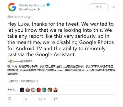 Google 發(fā)言人在回復(fù)媒體的信函中表示:“我們非常重視用戶的隱私。在我們調(diào)查這個 BUG 期間,我們已經(jīng)禁用了在 Android TV 上通過 Google Assistant 或者 Google Photos 查看圖片的投屏功能。”