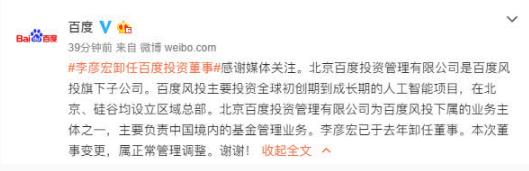 針對此次變更,百度回應稱:感謝媒體關注。北京百度投資管理有限公司是百度風投旗下子公司。百度風投主要投資全球初創期到成長期的人工智能項目,在北京、硅谷均設立區域總部。北京百度投資管理有限公司為百度風投下屬的業務主體之一,主要負責中國境內的基金管理業務。李彥宏已于去年卸任董事。本次董事變更,屬正常管理調整。謝謝!