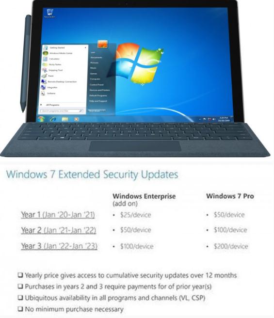 微軟現已宣布將從 2019 年 4 月 1 日開始銷售 Windows 7 擴展安全更新,價格清單如下所示,最低 25 美元一臺,Windows 7 ESU 將按設備銷售,每年的價格將翻倍。在 2020 年 1 月 14 日之后,微軟將不再為運行 Windows 7 的 PC 提供安全更新或支持。