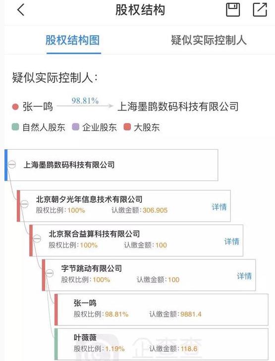 該公司在企查查的更新消息顯示,目前上海墨鹍數碼科技有限公司(下文稱“上海墨鹍”)的法定代表人已改為今日頭條的高級副總裁張利東。從上海墨鹍現有的股權結構來看,字節跳動有限公司已經成為上海墨鹍的控股公司。