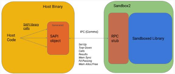 從高層次的角度看,Sandboxed API 將要加入沙箱的庫和其調用者分成兩個獨立的操作系統進程:主機二進制文件和沙箱。具體的工作流程是:實際的庫調用由主機端的 API 對象進行編組,通過進程間的通信發送到沙箱,沙箱的 RPC stub 會進行解組,并將調用轉發到原始庫。