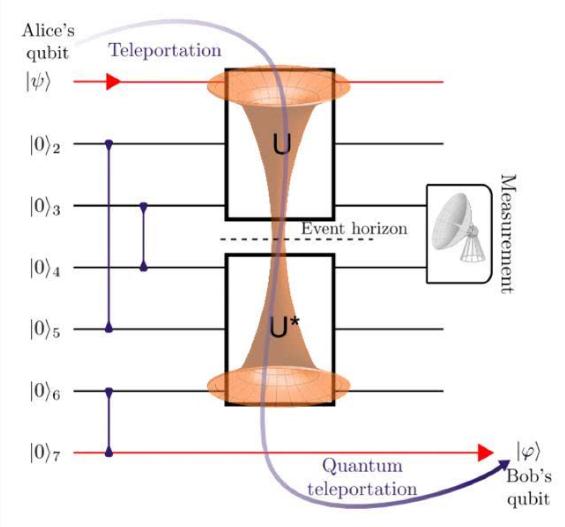 由馬里蘭大學(xué)的物理學(xué)家構(gòu)建的七比特量子計(jì)算機(jī)電路,這個(gè)電路用量子傳態(tài)來檢測(cè)信息的擾亂。它和通過一個(gè)可穿越蟲洞來實(shí)現(xiàn)信息傳輸是相似的,可以允許 Bob 來定出 Alice 扔進(jìn)黑洞的量子態(tài)。