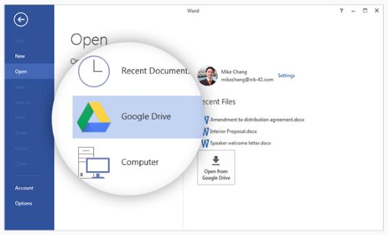 隨著 Google Drive File 系統的新插件開始發揮作用,用戶將能夠保存和打開 Google Drive 文件,而無需使用 Office 插件提供的界面,常規菜單將可以直接調用 GDrive 中的文檔。