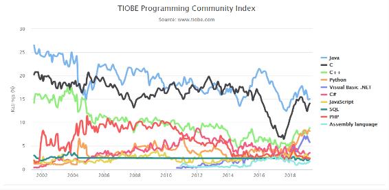 TOP 10 編程語言 TIOBE 指數(shù)走勢(shì)(2002-2018)