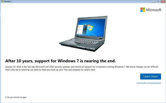 部分 Windows 7 用戶可能在上周收到了微軟的通知,這是因為微軟正式啟動了支持到期的系統通知,通知內容是 Windows 7 即將在 2020 年 1 月 14 日終止支持。微軟提醒用戶為新版系統做準備,同時附上了詳情的鏈接按鈕。點擊按鈕跳轉的網頁提供了備份系統數據的信息,以及升級到 Windows 10 的建議。