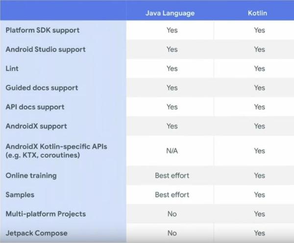 表中可以看到,Kotlin 相比 Java,在 Android 開發(fā)中確實(shí)獲得了更加重要的地位,“比如在線培訓(xùn)、樣本,我們首先會在 Kotlin 中支持,Java 中將是‘盡力而為’。同時(shí),有一些功能,如多平臺項(xiàng)目和 Jetpack Compose,只會在 Kotlin 中提供。”