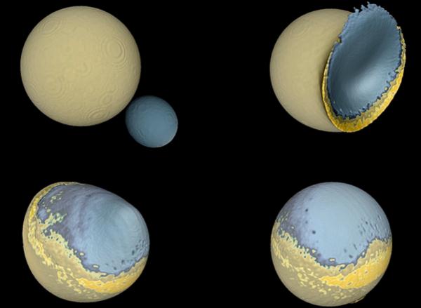 圖說:月球是如何形成的:模擬的原始月球和另一顆地球衛星之間的碰撞顯示,碰撞后二者質量嵌合在一起,產生了不對稱的半球。淺藍色表示月球地殼、深藍色為月球地幔,黃色為一層上地幔物質,代表了熔巖組成的“海洋”。另一顆衛星的大部分都以薄層堆積起來,形成了類似月球背面高地的山區。