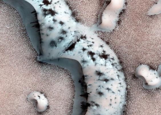火星上的冰蓋是由水冰和凍結的二氧化碳結合而成的,這與地球上由水冰構成的冰蓋是不一樣的。與氣態(tài)的二氧化碳一樣,凍結的二氧化碳在讓陽光穿透時也會將熱量困住。在夏天,這種固態(tài)的溫室效應會在冰層下導致小范圍的升溫。
